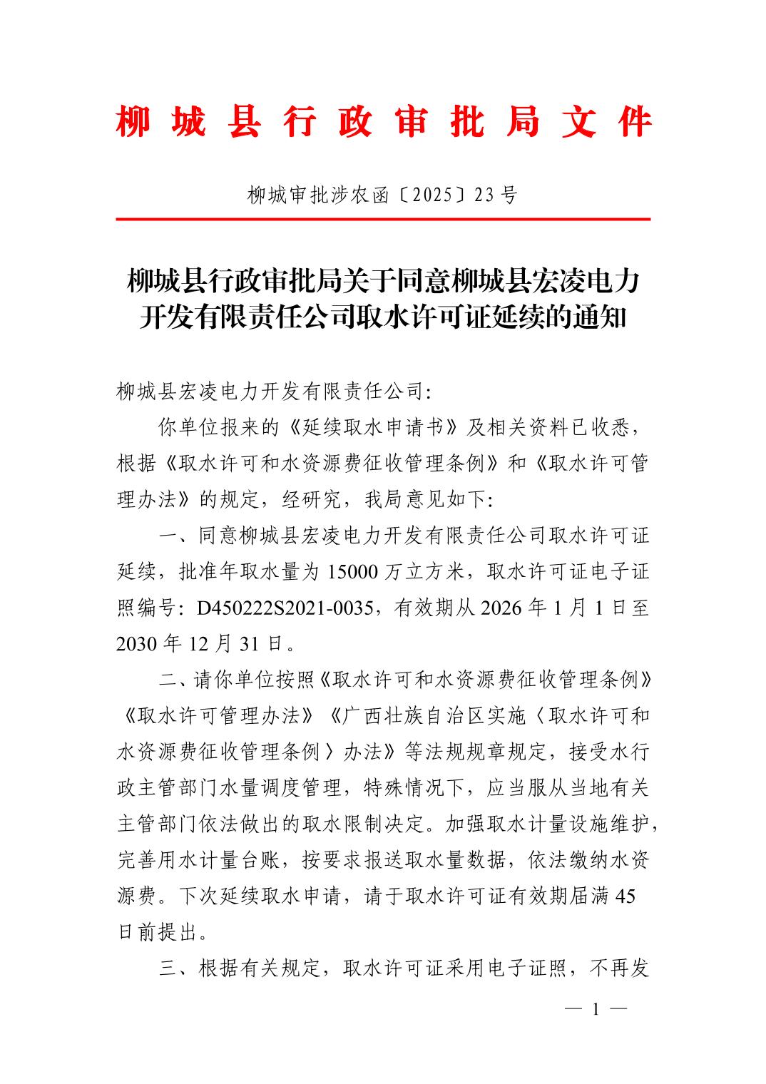 柳城縣行政審批局關(guān)于同意柳城縣宏凌電力開發(fā)有限責(zé)任公司取水許可證延續(xù)的通知
