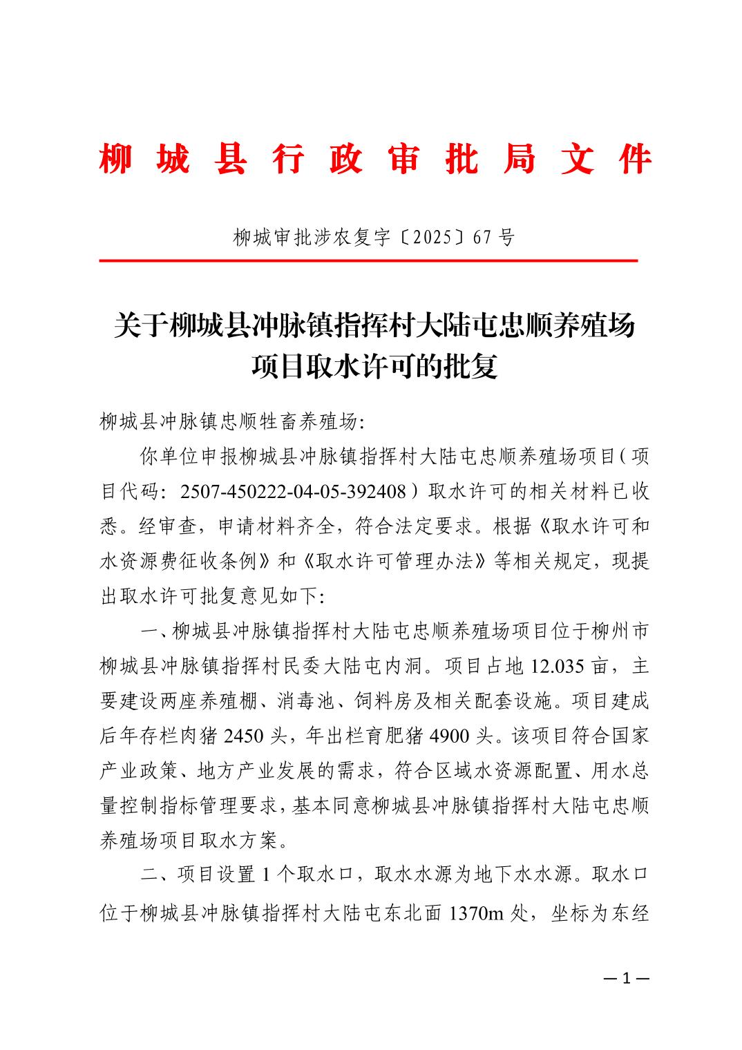 關(guān)于柳城縣沖脈鎮(zhèn)指揮村大陸屯忠順養(yǎng)殖場項(xiàng)目的取水批復(fù)