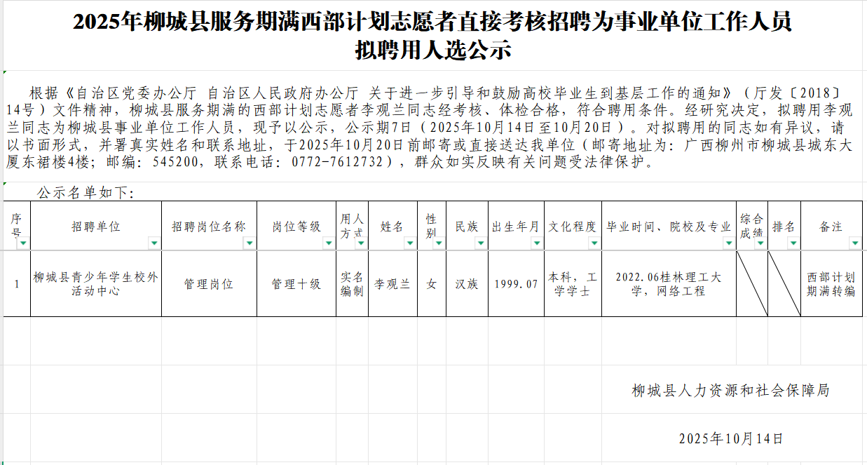 2025年柳城縣服務(wù)期滿西部計劃志愿者直接考核招聘為事業(yè)單位工作人員擬聘用人選公示