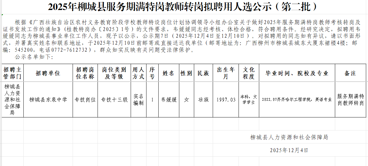 2025年柳城縣服務(wù)期滿特崗教師轉(zhuǎn)崗擬聘用人選公示(第二批)