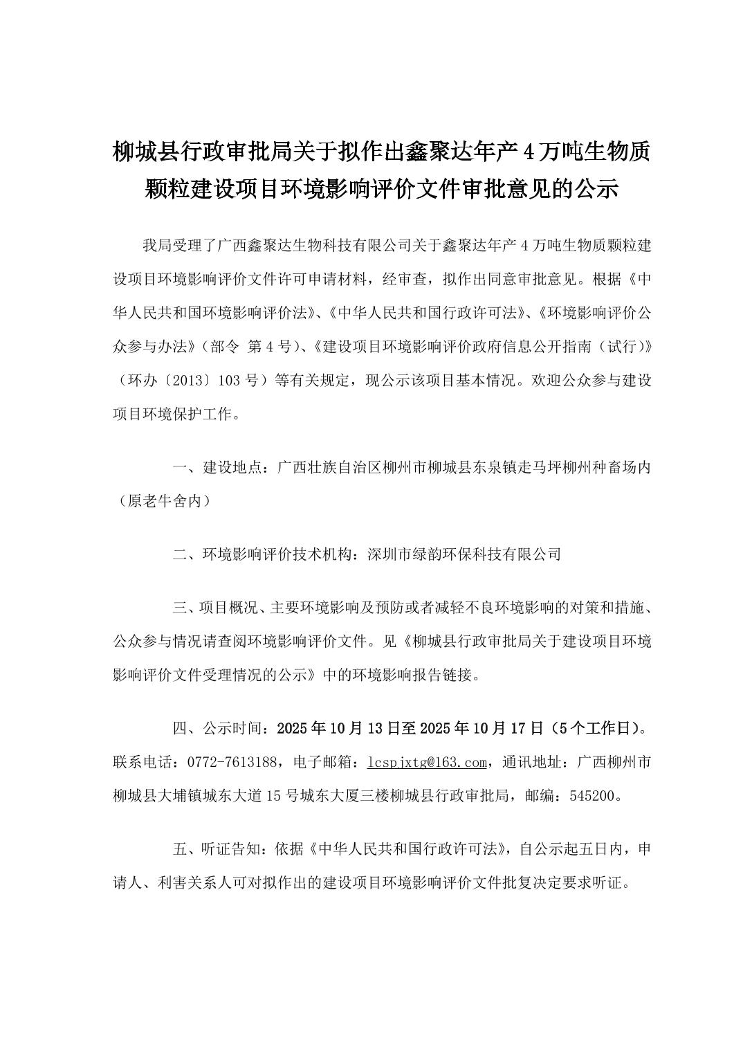 柳城縣行政審批局關(guān)于擬作出鑫聚達(dá)年產(chǎn)4萬噸生物質(zhì)顆粒建設(shè)項目環(huán)境影響評價文件審批意見的公示