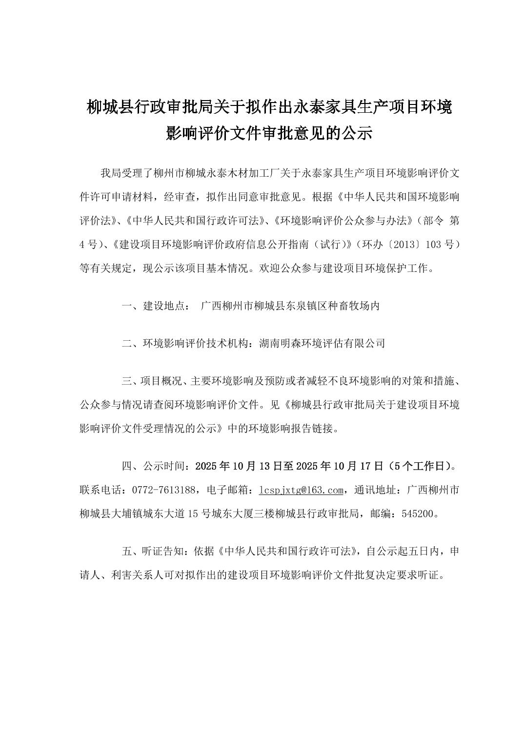 柳城縣行政審批局關(guān)于擬作出永泰家具生產(chǎn)項目環(huán)境影響評價文件審批意見的公示
