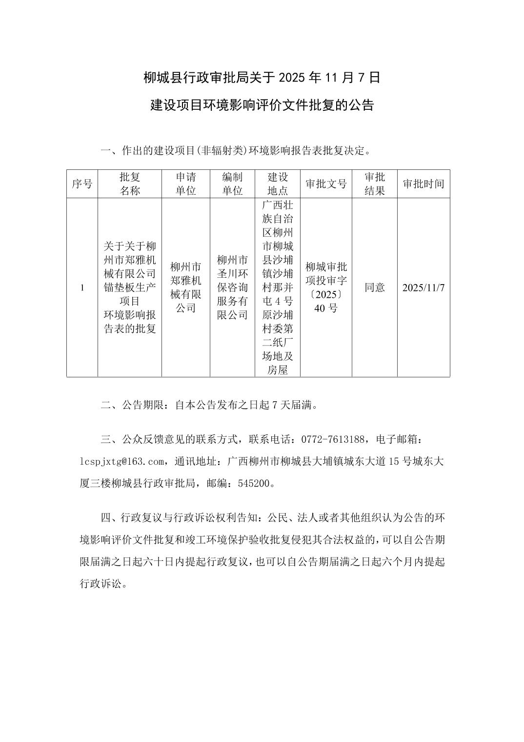 〔2025〕40號-關于柳州市鄭雅機械有限公司錨墊板生產(chǎn)項目的批復.docx