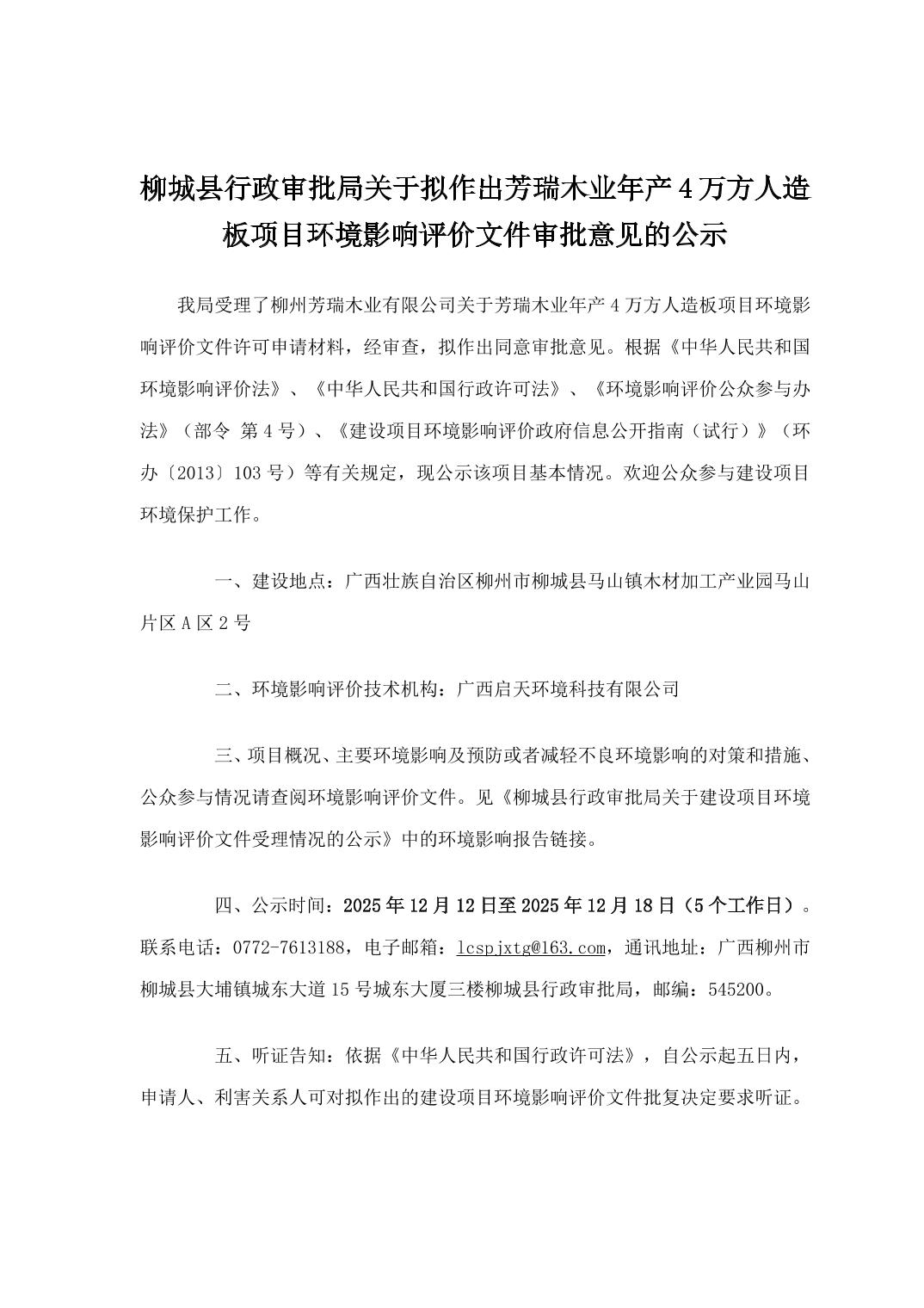 柳城縣行政審批局關(guān)于擬作出芳瑞木業(yè)年產(chǎn)4萬方人造板項目環(huán)境影響評價文件審批意見的公示