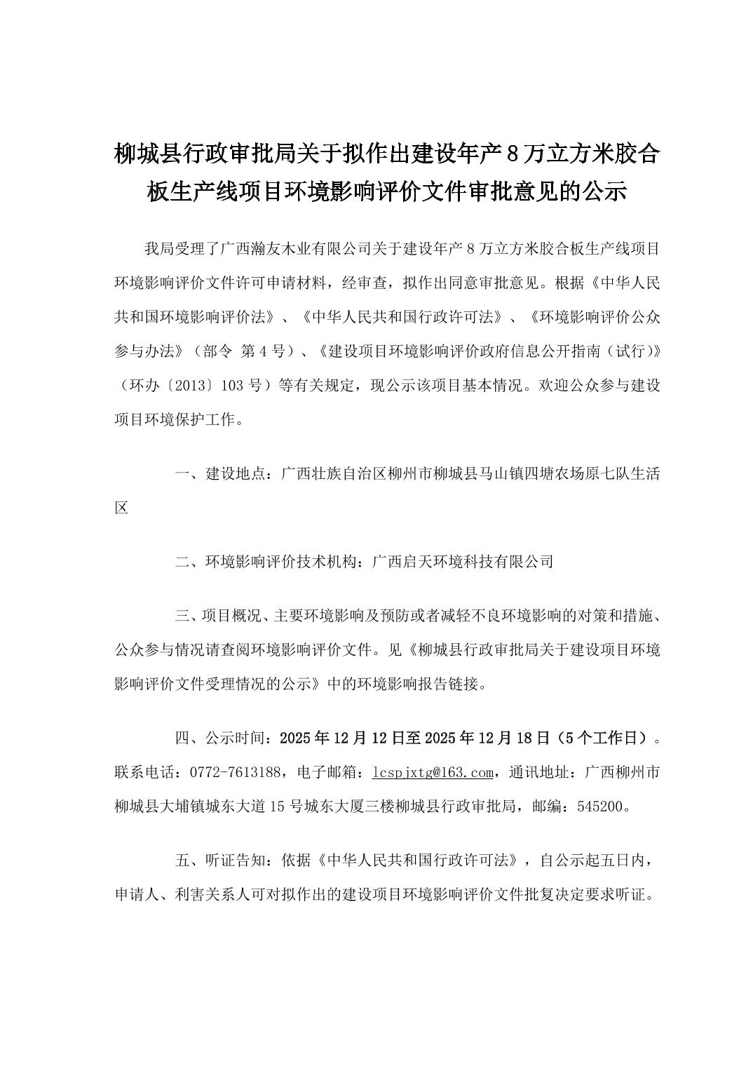 柳城縣行政審批局關(guān)于擬作出建設(shè)年產(chǎn)8萬立方米膠合板生產(chǎn)線項目環(huán)境影響評價文件審批意見的公示